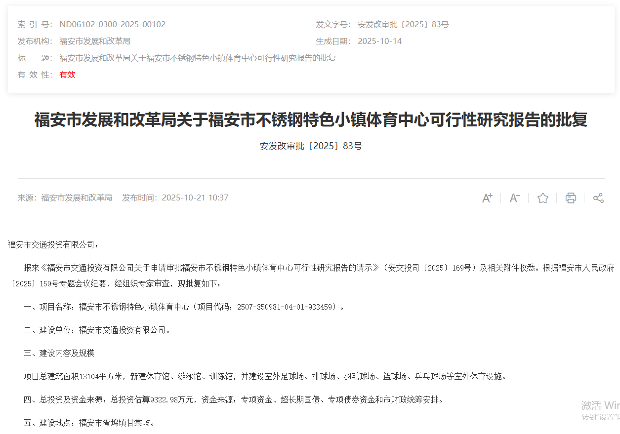 2025年10月14日,福安市發展和改革局就福安市不銹鋼特色小鎮體育中心可行性研究報告作出批復意見。