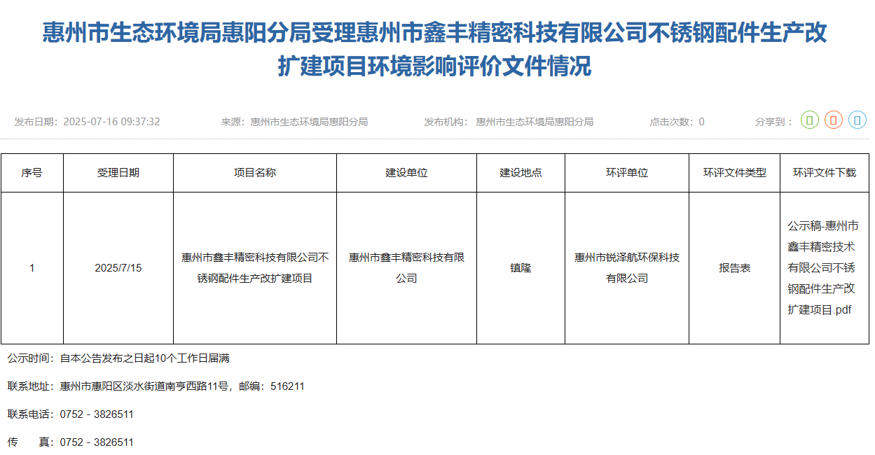 2025年7月15日,惠州市生態(tài)環(huán)境局惠陽分局受理惠州市鑫豐精密科技有限公司不銹鋼配件生產(chǎn)改擴建項目環(huán)境影響評價文件并對外進(jìn)行公示,公示期:10個工作日。